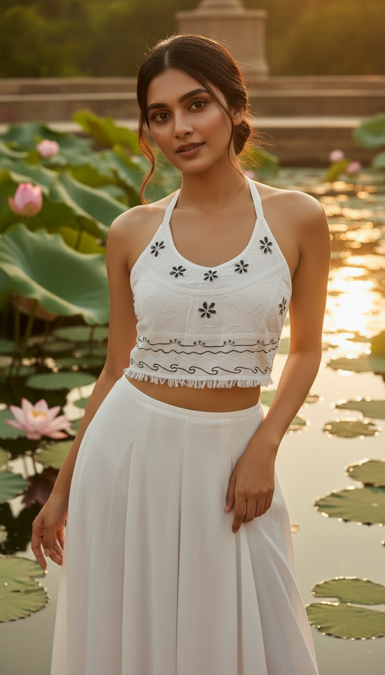 Elevate your seasonal wardrobe with this Chic Embroidered Halter Crop Top, a perfect blend of modern elegance and bohemian flair. Crafted from premium, breathable fabric, this white halter top features intricate floral embroidery and a unique fringed hemline that adds a touch of artisanal charm to any outfit.