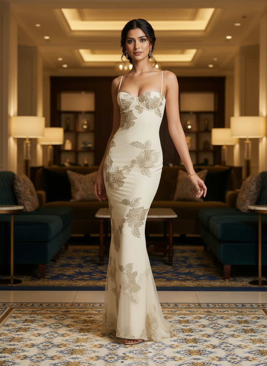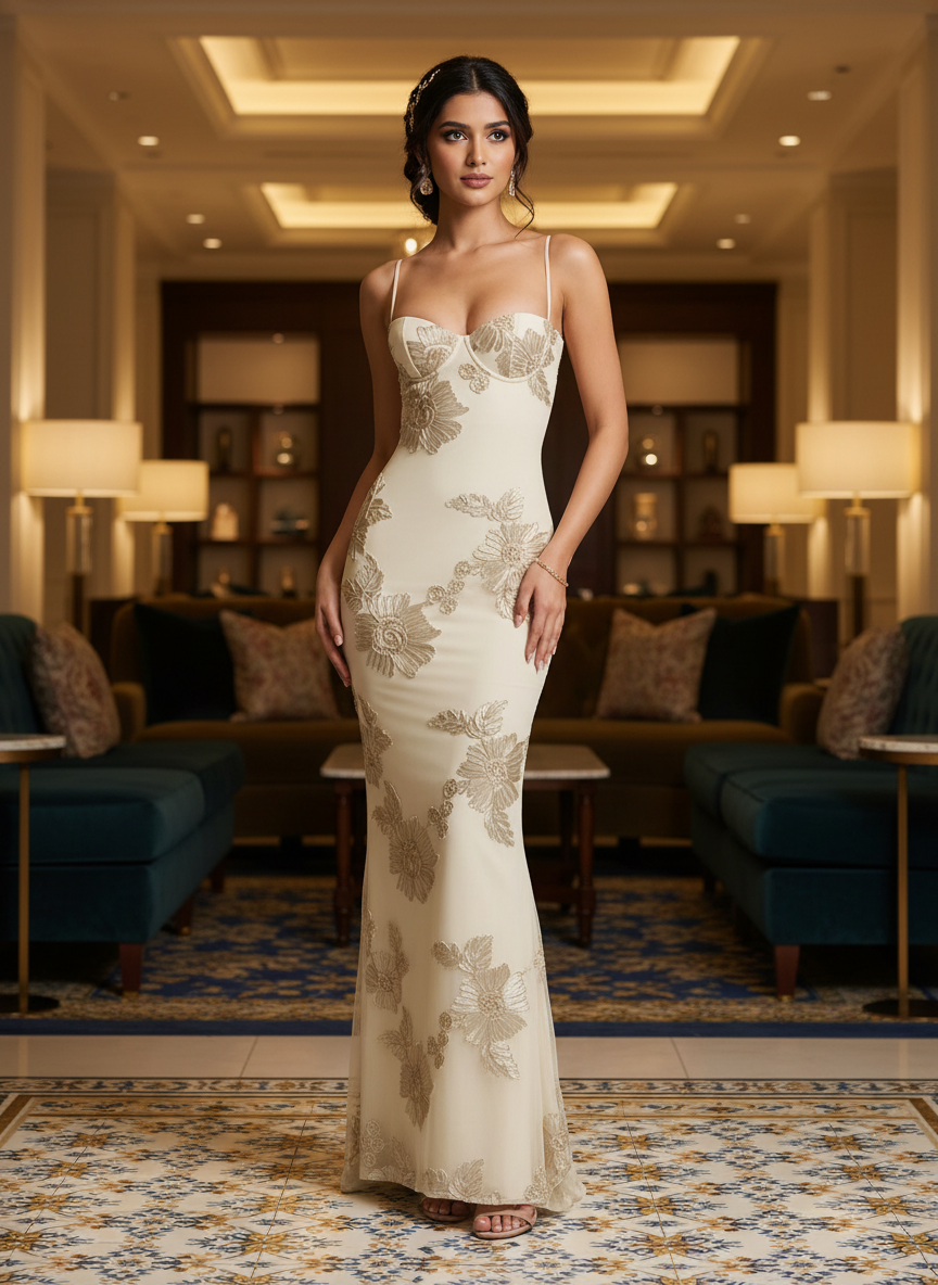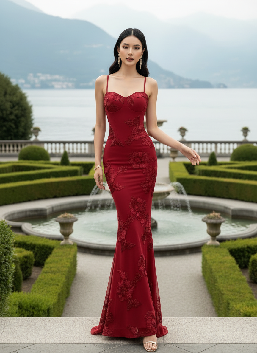 & Free ShippingMake an unforgettable entrance in this exquisite floral appliqué evening gown. Combining the structure of traditional corsetry with the ethereal beauty of botanical embroidery, this floor-length dress is a masterpiece of modern evening wear. Designed for the woman who loves romance with a high-fashion edge, it offers a sculpted silhouette that transitions into a graceful mermaid flare.