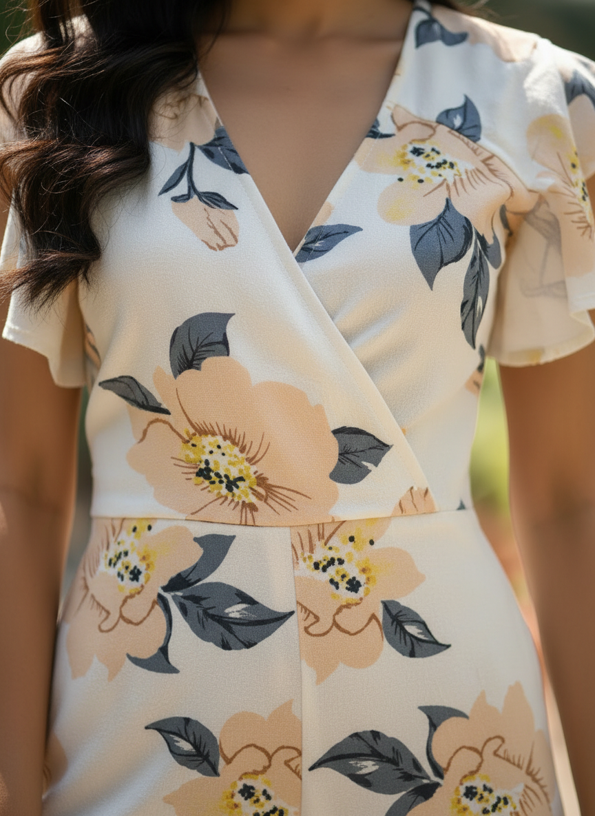 Step into effortless sophistication with this Floral V-Neck Flutter Sleeve Jumpsuit, the ultimate statement piece for your warm-weather wardrobe. This one-piece wonder features a beautiful oversized peach and charcoal floral print on a crisp ivory base, offering a timeless aesthetic that transitions perfectly from daytime events to evening soirées.