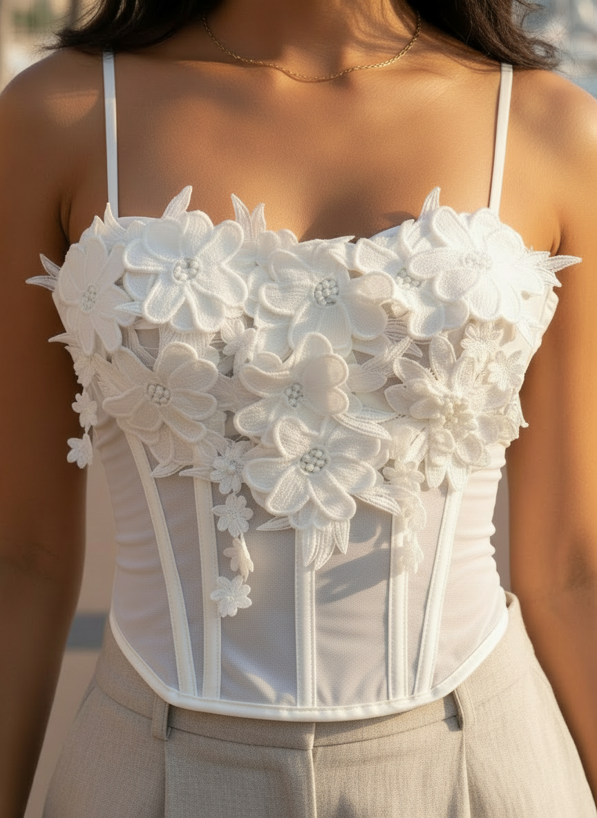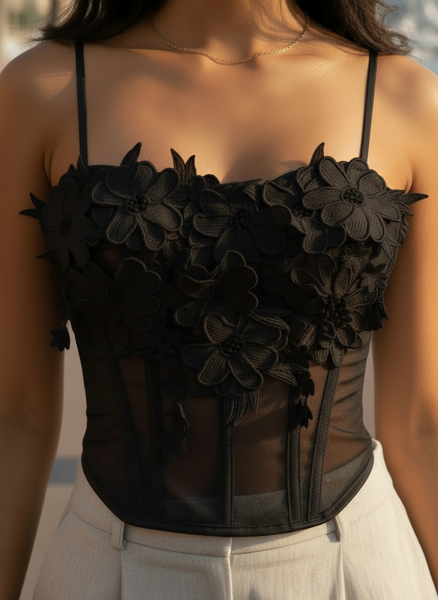 Petal-Scuplt Premium Mesh Corset Top – Floral Appliqué Bustier