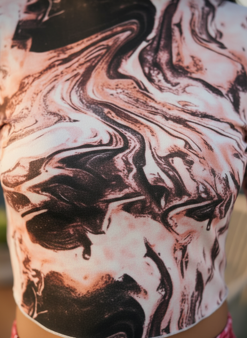 The Biker Edge: Pair this top with high-waisted black faux-leather trousers (as seen in our campaign) and combat boots. Add a silver chunky chain necklace to play off the cool tones in the marble print. This look is perfect for concerts, gallery openings, or dinner in the city.