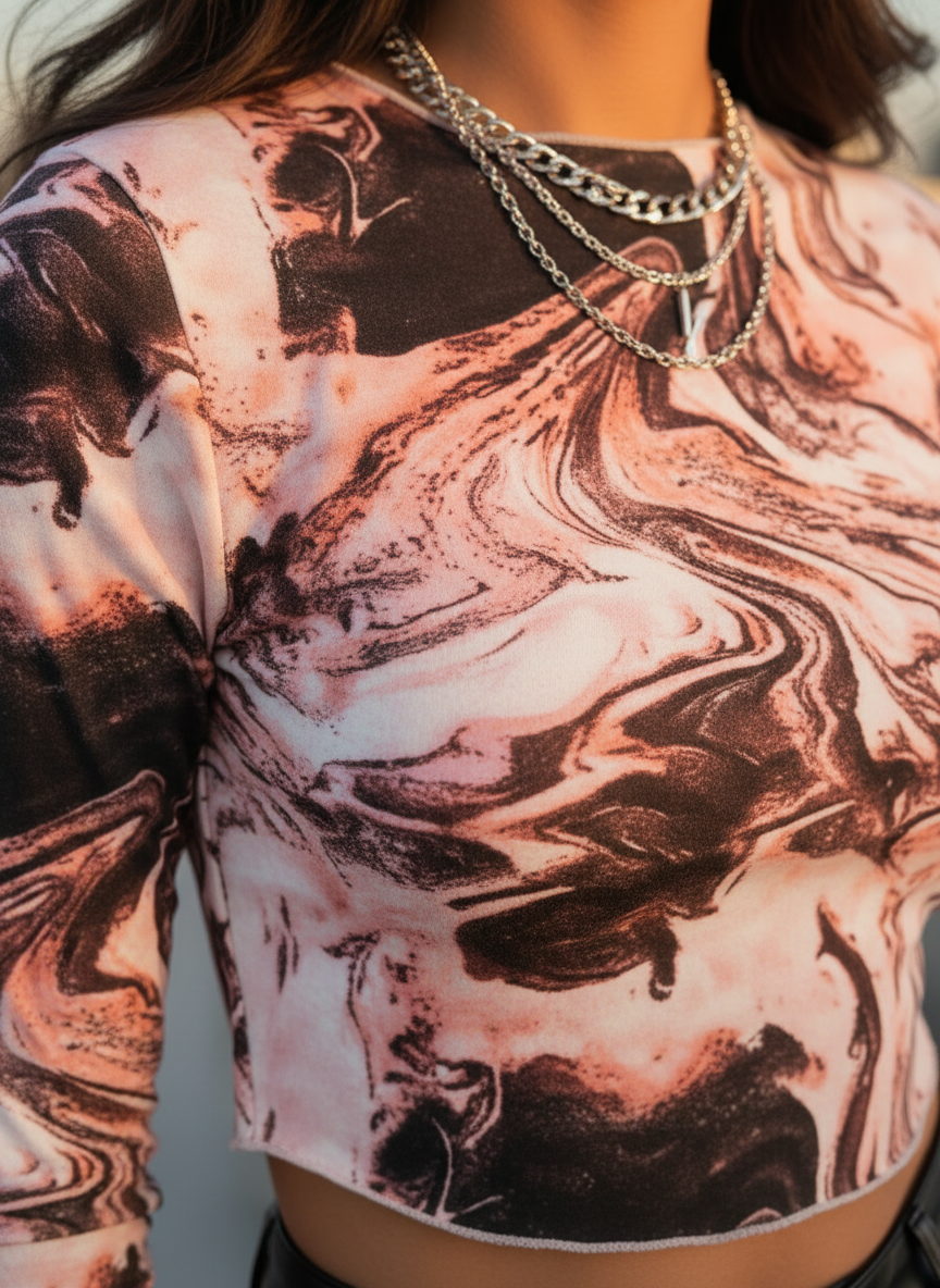 High SEO Compatibility: This top hits all the trending search terms for 2026, including “marble print streetwear,” “rose gold aesthetic,” and “long sleeve cropped basics.”
