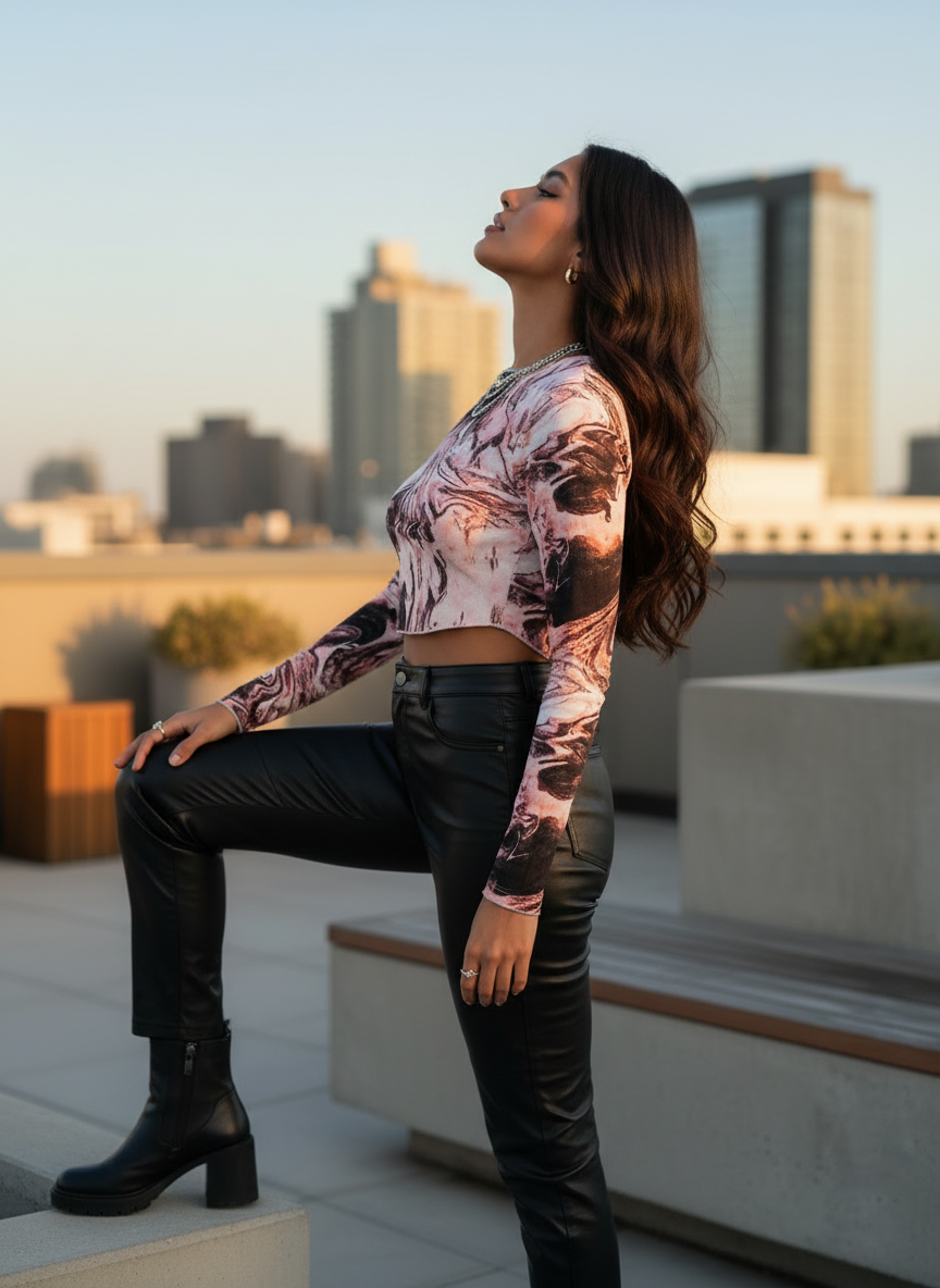 The Long Sleeve Rose Marble Crop Top is a master of versatility. Here is how to style it for maximum impact: